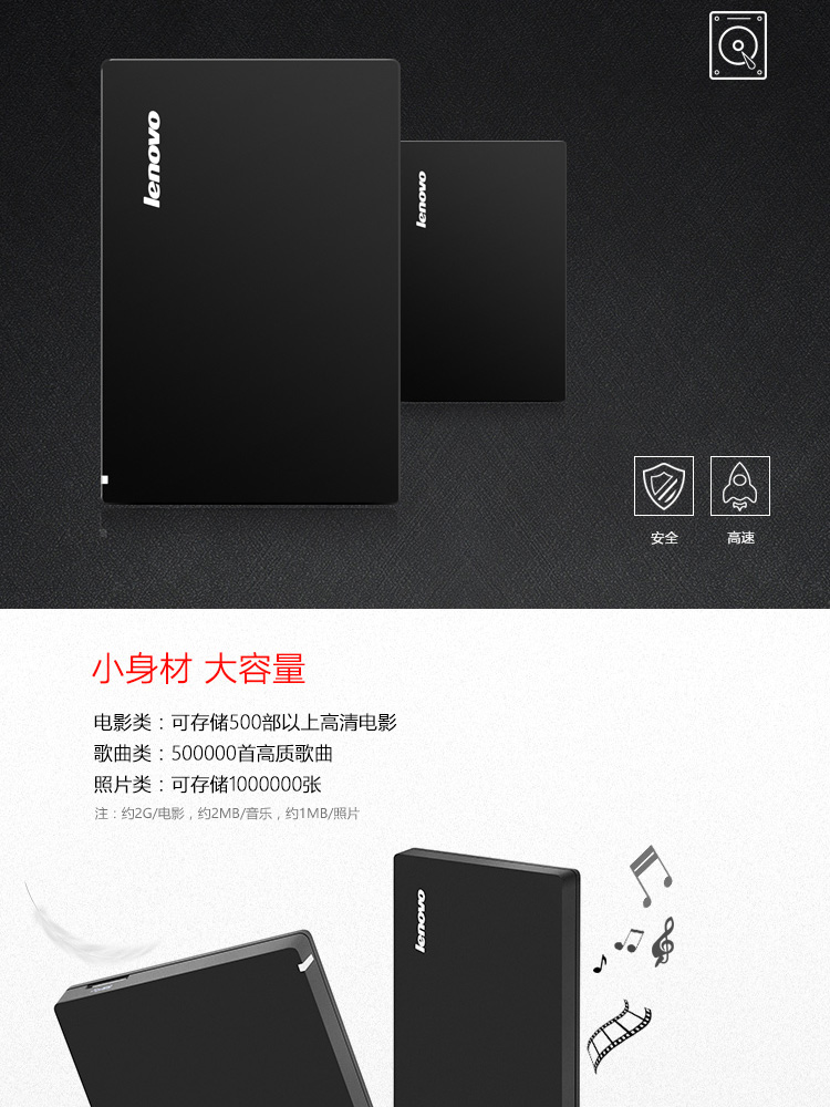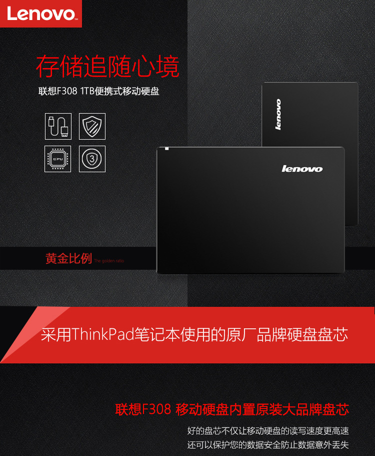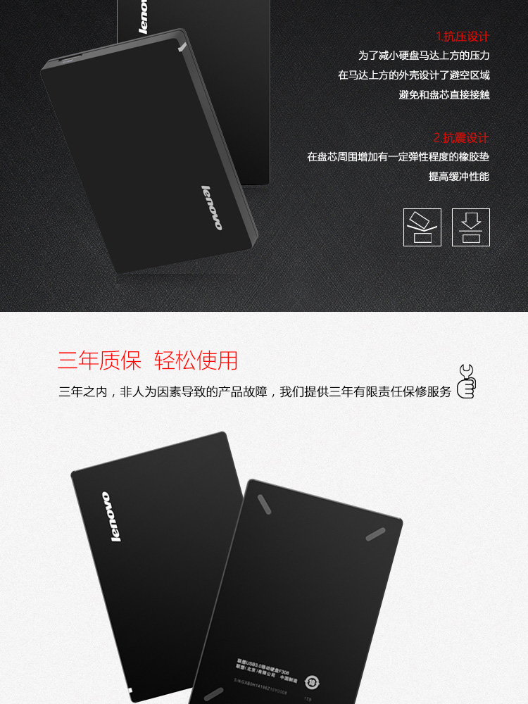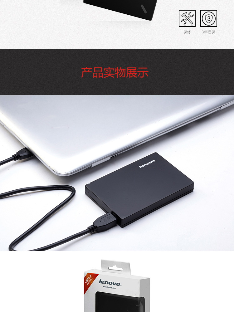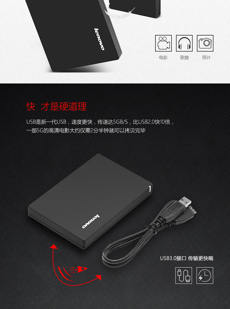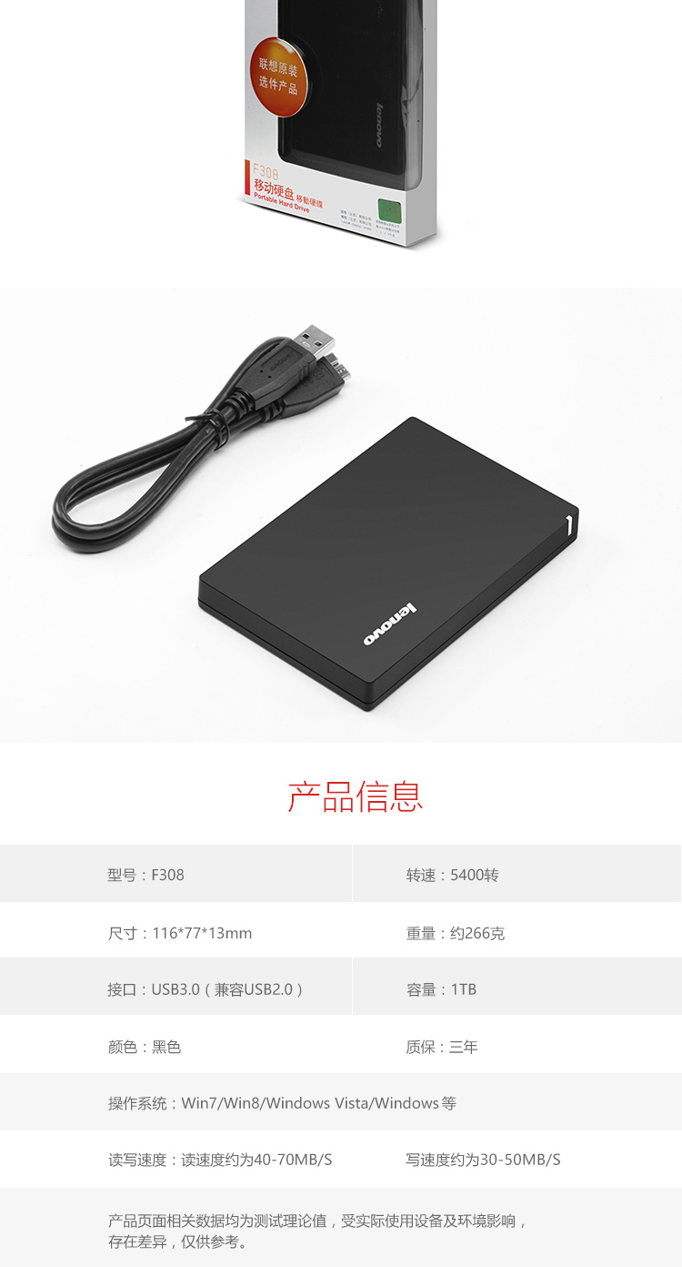 联想(Lenovo) F308 1TB USB3.0 移动硬盘2.5英寸 黑色 便携个人云外接硬盘