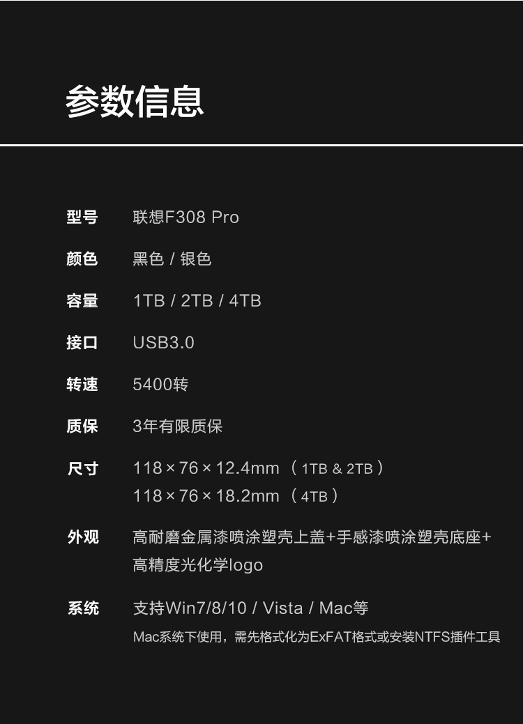 联想(Lenovo) F308 Pro 1TB USB3.0 移动硬盘2.5英寸 暮辰黑 时尚超薄轻松备份 高速传输